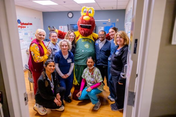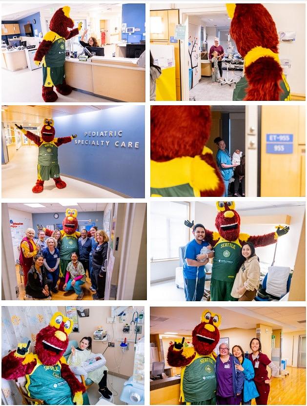 Patients, families and caregivers on the pediatric unit and in the neonatal intensive care unit (NICU) at Swedish First Hill enjoyed a special visitor recently: Doppler, the beloved mascot of the Seattle Storm.